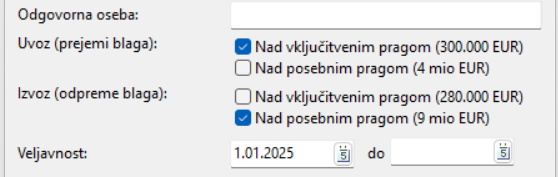 V modulu Intrastat se prag poročanja nastavi v šifrantu Poročevalske enote. Za posamezno poročevalsko enoto se nastavi, za katero smer je potrebno poročati podatke ter kateri prag poročanja se upošteva za posamezno smer poročanja.