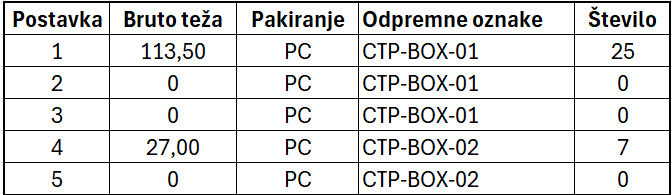 - prve tri postavke so pakirane v isto pakiranje z oznako CTP-BOX-01, četrta in peta postavka pa v pakiranje z oznako CTP-BOX-02