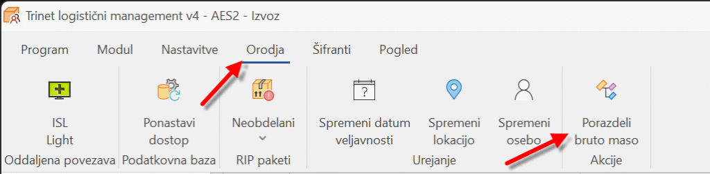 - če je izvozna deklaracija že pripravljena (in je vpisana skupna bruto teža v prvi postavki), lahko uporabite ukaz Orodja / Porazdeli bruto težo. Program bo skupno bruto težo porazdelil po vseh postavkah deklaracije glede na vpisano neto težo posamezne postavke